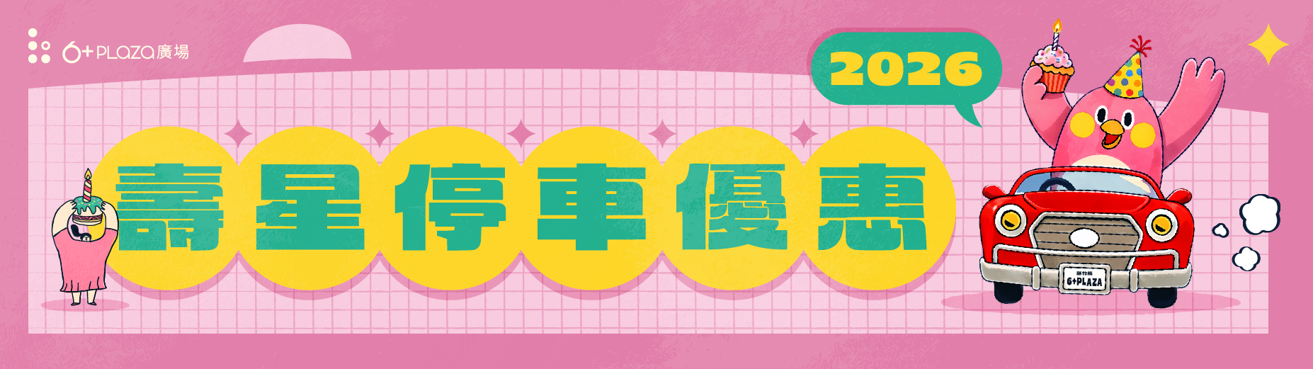 活動內容:每月當月壽星憑身分證及當日6+PLAZA開立發票即可至6+PLAZA 1F服務台兌換2小時免費停車折抵券
